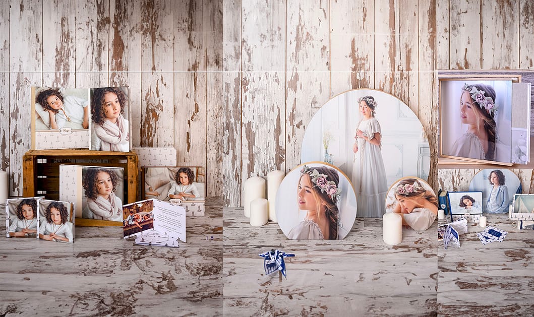 COLECCIÓN LUXE: 525 euros. caja estudio álbum de firmas, álbum 30×30, foto peana ,15 recordatorios, usb y foto grande en caja 40X40 más usb de madera con los archivos de la sesión,